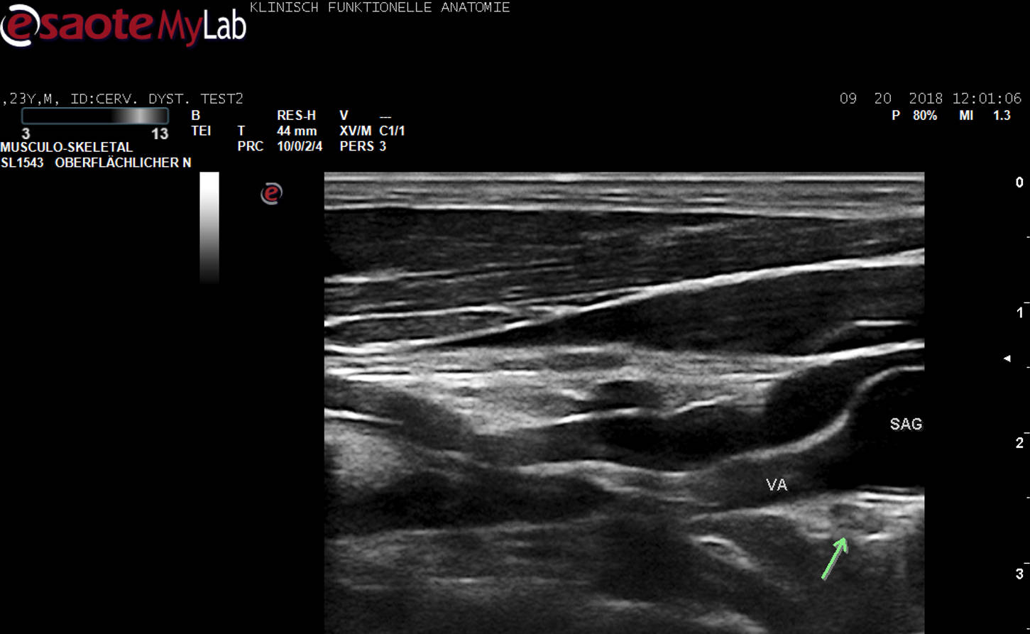Weltweit erste US-Darstellung des Ganglion stellatum (grüner Pfeil) in unmittelbarer Nachbarschaft zur A. vertebralis (VA).