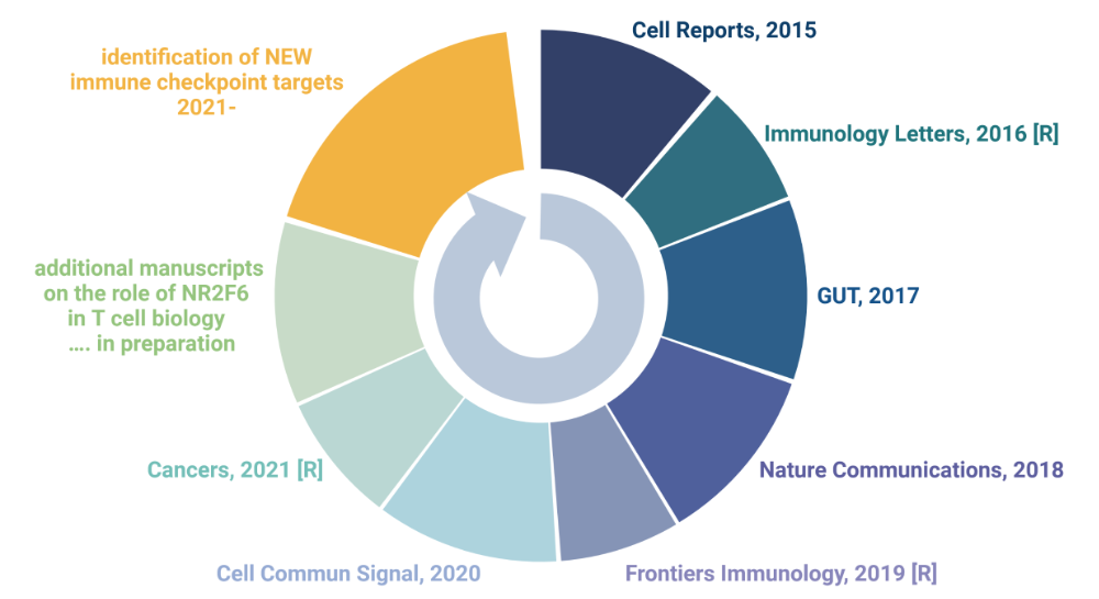 The identification of the nuclear orphan receptor NR2F6 as a checkpoint for cancer immune surveillance. We could show that Nr2f6-/-, and even Nr2f6 heterozygous mice spontaneously reject tumors due to increased infiltration of CD4 and CD8 positive T cells which produce more cytokines like IL2, IFNγ, and TNFα. Mechanistically we could show that NR2F6 acts as a suppressor of NFAT/AP-1 and if missing (like in the KO), more NFAT mediated cytokines can be transcribed.