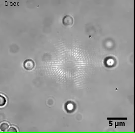 Fig. 2 Three-dimensional trapping pattern for silica beads formed by shaping both, amplitude and phase with a SLM. Particles are trapped along the high intensity lines and can be driven in or out by tailoring the phase gradients.