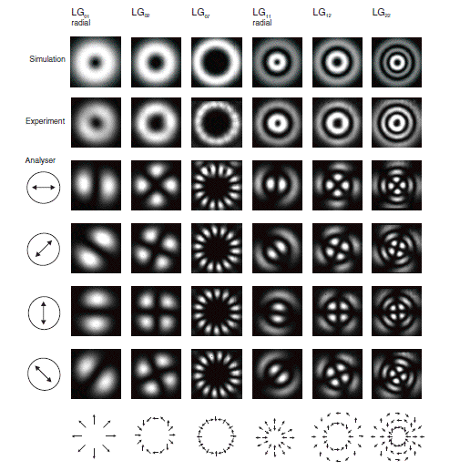 Phase masks on the SLM can be utilized to generate mode patterns of high quality. Using a “split SLM screen” technique, where one superposes two SLM-shaped beams with a chosen phase-shift, one can create Hermite-Gaussian and Laguerre-Gaussian vector beams, e.g. radially and axially polarized beams: