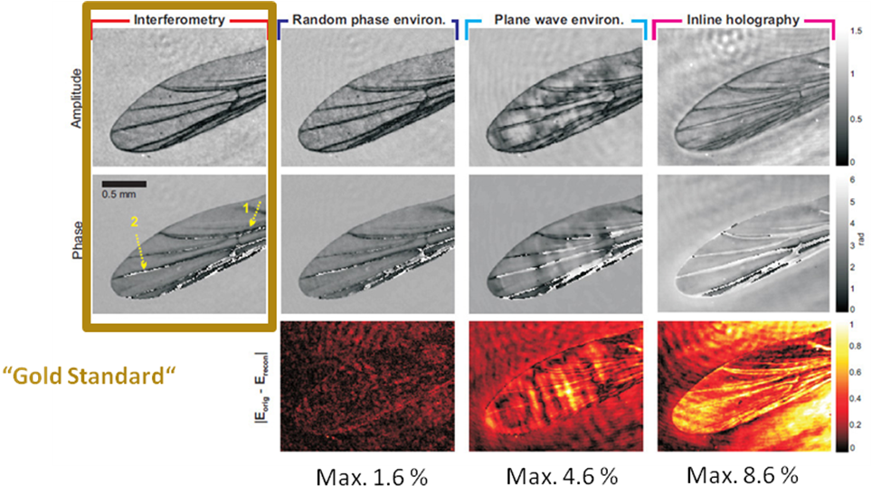 In a recent project complementing our SLM-imaging activities we have applied speckle patterns (generated by a diffuser plate with a central hole or by a pseudo-random phase pattern on a SLM) for “lensless holographic  imaging”, i.e. for holographic phase retrieval of an unknown amplitude or phase object.