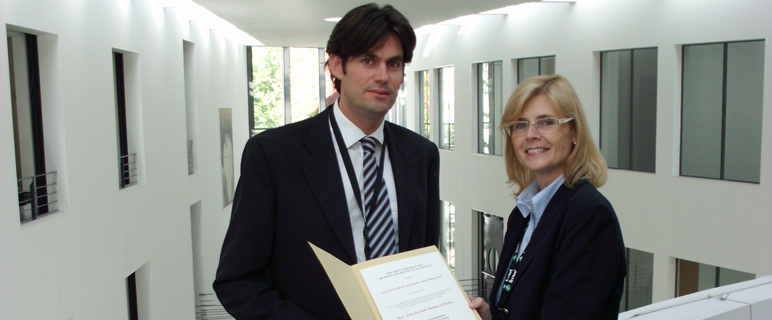 Für seine Habilitationsschrift zur Relevanz des Kiefer-Kau-Systems bei der Entwicklung und Aufrechterhaltung von chronischen Schmerzsyndromen wurde Priv.-Doz. Dr. Michael J. Fischer, wissenschaftlicher Mitarbeiter im Bereich Muskelgrundlagenforschung an der Universitätsklinik für Orthopädie (Direktor: Univ.-Prof. Dr. Martin Krismer) kürzlich von der Deutschen Gesellschaft für Physikalische Medizin und Rehabilitation ausgezeichnet.