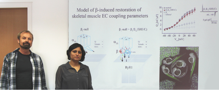 In der rezenten Forschungsarbeit, die gemeinsam mit der bekannten Expertin für Elektronenmikroskopie, Prof.in Clara Franzini-Armstrong vom Department of Cell and Developmental Biology der University of Pennsylvania und dem inzwischen graduierten MCBO (Molecular Cell Biology and Oncology) Dissertanten Vinayakumar Bhat entstanden ist, kann Anamika Dayal aus Prof. Grabners Labor die essentielle Rolle der DHPR β1a Untereinheit noch untermauern. „β1a ist unseren Untersuchungen zufolge keinesfalls, wie lange angenommen, nur ein Vehikel, das den DHPR Komplex an die Zellmembran führt. β1a fungiert auch als Schalter, der es der DHPR a1 Untereinheit erst ermöglicht, die Membranspannung nach einer Depolarisation zu erfühlen. Die Interaktion zweier Proteindomänen der β1a Untereinheit, nämlich der SH3 Domäne und eines C-terminalen Poly-Prolin-Motives dürfte für diese Funktion ausschlaggebend sein“, so Erstautorin Dayal. Für ihre Untersuchungen bedienten sich die Forscher:innen um Prof. Grabner des an der Sektion etablierten Zebrafisch-Modellorganismus, der aufgrund der Hautatmung, trotz fehlender DHPR β1a Untereinheit, relativ lange überlebt und damit die Arbeit an voll ausdifferenzierten Muskelzellen ermöglicht.