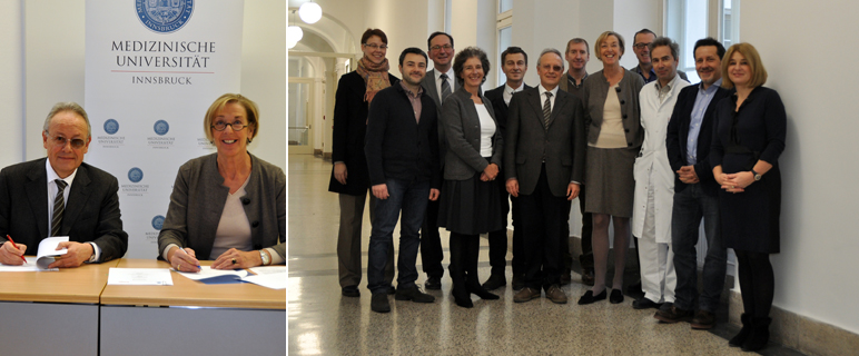 Exzellente Ausbildung und Forschung über die Grenzen hinweg vernetzen – dies ist das Ziel, das die Europäische Akademie Bozen (EURAC) und die Medizinische Universität Innsbruck gemeinsam verfolgen. So unterzeichneten Medizin Uni Rektorin Helga Fritsch und EURAC-Präsident Werner Stuflesser am heutigen 4. Februar 2015 eine Vereinbarung (BI-DOC), auf deren Grundlage vier neue Doktorand:innenstellen von den beiden Institutionen eingerichtet, finanziert und wissenschaftlich betreut werden.