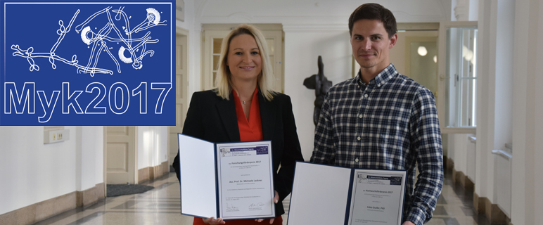 Zwei Forscher:innen der Medizinischen Universität Innsbruck sind im Rahmen der 51. Jahrestagung der „Deutschsprachigen Mykologischen Gesellschaft“ (DMykG) in Münster (D) ausgezeichnet worden. Ass.-Prof.in Priv.-Doz.in Mag.a Dr.in Michaela Lackner erhielt in Anerkennung ihrer herausragenden, international beachteten Leistungen den Forschungsförderpreis. Der Nachwuchsförderpreis für klinische Mykologie ging an Mag. Dr. Fabio Gsaller und damit zum zweiten Mal in Folge nach Innsbruck.