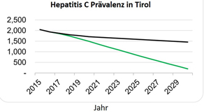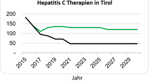 Basierend auf den Daten des Hepatologischen Labors wurden epidemiologische Modellrechnungen für Tirol durchgeführt. Diese Modelle zeigen, dass ohne gezielte Aktivitäten zur Steigerung der Diagnose- und Behandlungszahlen die HCV Prävalenz – also die Häufigkeit von Hepatitis C Virusinfektionen – von 2015 bis 2030 nur langsam geringer wird. Werden keine gezielten Aktivitäten zu Steigerung der Hepatitis C Neudiagnosen gesetzt, können die von der WHO vorgegebenen Ziele nicht erreicht werden (siehe schwarze Linie in den Grafiken).Nur wenn in den kommenden Jahren 130 Tiroler Patient:innen pro Jahr oder mehr behandelt werden, kann die Hepatitis C in Tirol – gemäß der WHO Definition – eliminiert werden (siehe grüne Linie in den Grafiken). „Da durch höhere Behandlungsraten von rund 1.000 Patienten bis zum Jahr 2030 auch zusätzliche Neuinfektionen verhindert werden, könnten dadurch allein in Tirol in den kommenden Jahren über 1.250 Hepatitis C-Erkrankungen geheilt bzw. vermieden werden“, prognostiziert der Hepatologe Zoller.