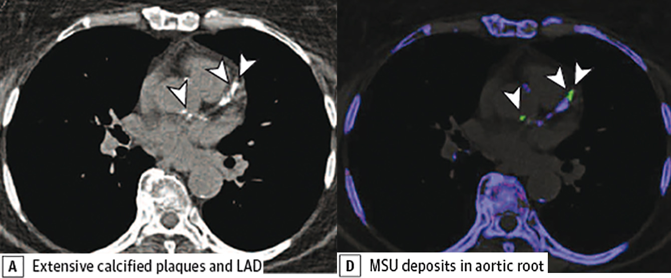 Das Auftreten von Gichterkrankungen nimmt in den letzten Dekaden zu. Verschiedene Studien haben bereits länger gezeigt, dass die Gicht als Risikofaktor für eine koronare Herzkrankheit im Zusammenhang steht. Bis dato war der Nachweis von Gichtkristallen in Geweben nur mittels Biopsie/Punktion und aufwändigen mikroskopischen Verfahren möglich. Die Arbeitsgruppe von Andrea Klauser von der Universitätsklinik für Radiologie (Direktor Werner Jaschke) erforscht bereits seit Jahren erfolgreich Gichtausfällungen in Gelenken mittels der Dual-energy-Computertomografie (DECT). „Für uns war es somit naheliegend, den Stellenwert dieser Bildgebungstechnik auch in der kardiovaskulären Bildgebung zu prüfen“, sagt Klauser. Für die Darstellung wird eine CT-Untersuchung mit zwei verschiedenen Strahlungsenergien durchgeführt. „Es wird ein CT-Gerät eingesetzt, das Zweienergiemessungen ohne relevante Erhöhung der Strahlendosis mit höchster Auflösung ermöglicht“, so die Radiologin. Das Hauptziel dieser ersten, kürzlich im JAMA Cardiology publizierten Studie, war die Prüfung der Möglichkeit von DECT im Nachweis von kardiovaskulären Harnsäureablagerungen (Uratablagerungen). „Dafür wurden DECT-Untersuchungen von Patienten mit Gicht und ohne Gicht prospekiv untersucht und die Untersuchungsergebnisse verglichen“, beschreibt Andrea Klauser die Vorgehensweise. Insgesamt wurden 59 Gichtpatient:innen (mittleres Alter 59) und 47 Kontrollen (mittleres Alter 70) untersucht.