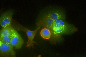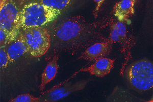 BU Abb. 1: Mikroskopische Aufnahme von Kupfferzellen (rot umrandet) und primären Hepatozyten. Das LDL-Cholesterin ist grün gefärbt. Zu diesem Zeitpunkt (24h nach Eisendiät) sind die meisten Kupfferzellen noch grün markiert, sie transferieren ihre Ladung (Cholesterin) zu den Hepatozyten. (Zellkerne sind blau gefärbt).