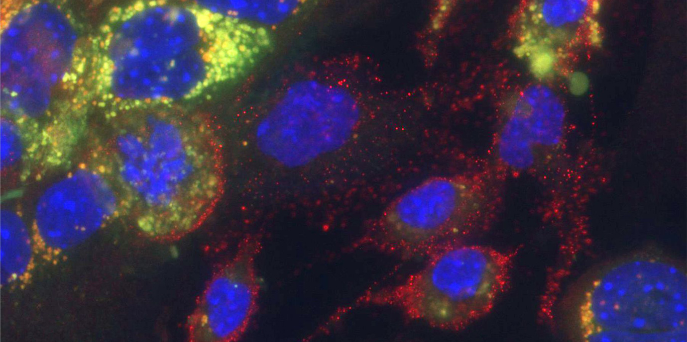 BU Abb. 2: Mikroskopische Aufnahme von Kupfferzellen (rot umrandet) und primären Hepatozyten nach 48h. Das Cholesterin (grün) wurde fast vollständig an die primären Hepatozyten abgegeben.