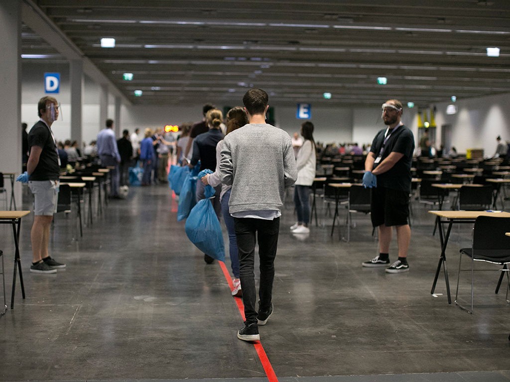 Auch die regelmäßige Desinfektion der Hände war vorgesehen. Gruppenbildungen sollen vermieden werden, so gab es auch keine Garderoben. Die Kandidat:innen erhielten Garderobensäcke, in denen sie ihre Dinge verstauen mussten und die gut verschlossen unter den Tischen gelagert wurden. Auch ein kontrollierter Abstrom der Teilnehmer:innen war eingeplant. Für die Studienwerber:innen, die zur Covid-19-Risikogruppe gehörten, gab es eigene Regeln, die ihre Situation berücksichtigen, dazu gehörten beispielsweise eigene Zugangszeiten und -wege sowie separate Räumlichkeiten.