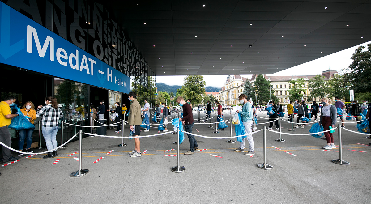 In Innsbruck hat Sicherheits- und Ordnungspersonal den geordneten Zustrom und die Einhaltung des Abstandes von mindestens einem Meter sowie das Tragen eines MNS am Veranstaltungsgelände und in den Messehallen überwacht. Besonders beanspruchte Flächen wurden bereits im Vorfeld aber auch während des Testtages speziell gereinigt und desinfiziert. Alle Teilnehmer:innen mussten den MNS tragen, bis sie ihre Plätze eingenommen haben. Sobald sie diesen verlassen, um zum Beispiel auf die Toilette zu gehen oder beim Austeilen der Testbögen, war der MNS wieder aufzusetzen. Vor dem Betreten der Räumlichkeiten erfolgte eine verpflichtende, kontaktlose Fiebermessung für alle.