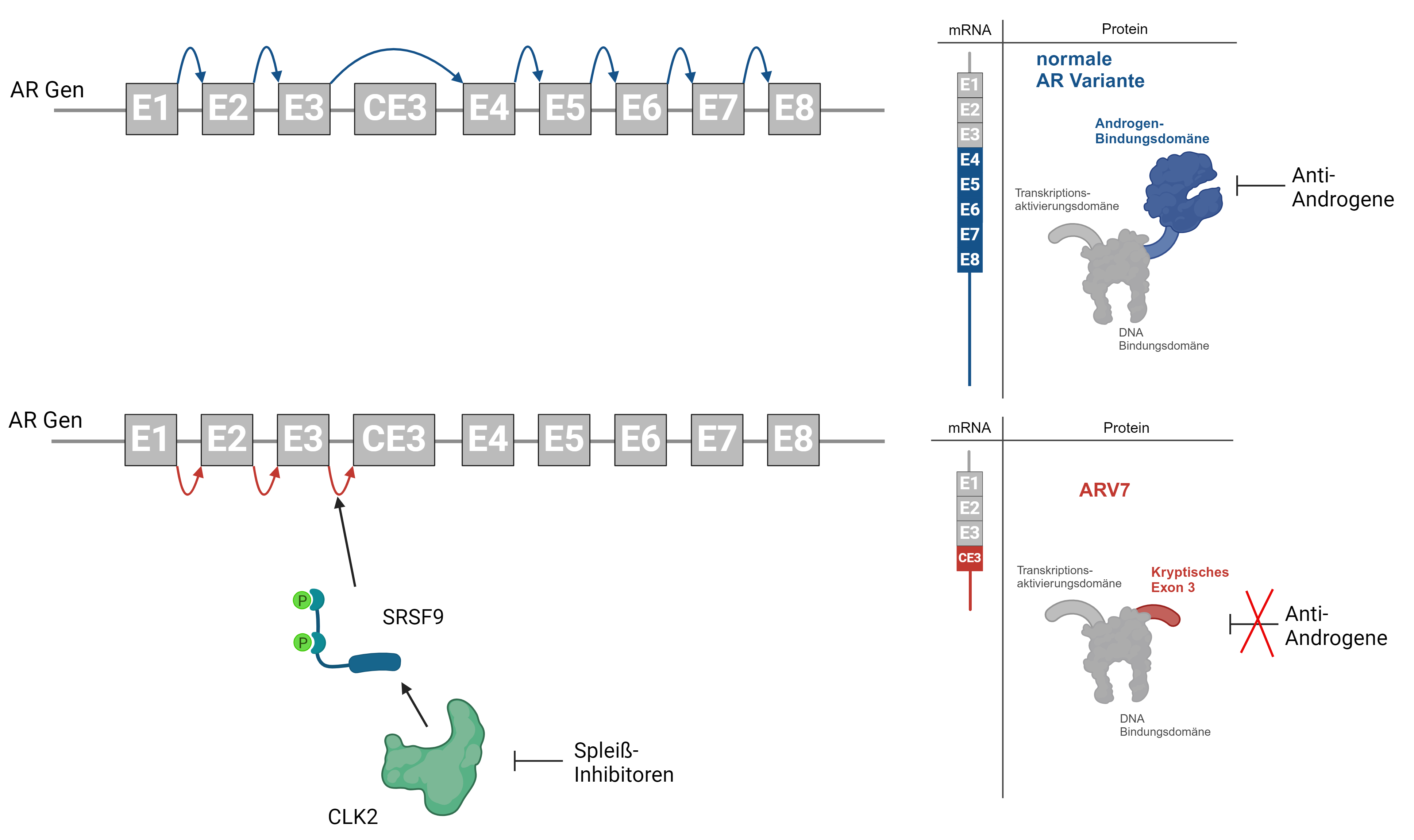 Ein kürzlich entdeckter Mechanismus, welcher es den Prostatakrebszellen ermöglicht, endokrinen Therapien zu entgehen, ist die Synthese von verkürzten AR-Varianten (AR-V) denen die sogenannte Androgen-Bindungsdomäne fehlt. Trotz fehlender Androgenbindung sind AR-Vs, im Gegensatz zum „normalen“ AR, in der Lage Tumorwachstum und -progression auch in Abwesenheit androgener Stimuli zu gewährleisten. AR-Vs können auch nicht durch Anti-Androgene gehemmt werden. Sie entstehen durch alternatives Spleißen, einem molekularbiologischen Mechanismus welcher es den Zellen erlaubt, unterschiedliche Proteinvarianten aus einem Gen zu bilden. Dies garantiert den Zellen in weiterer Folge eine bessere Anpassung an veränderte Lebensbedingungen. In einigen Prostatakarzinomen führt die Aktivierung des alternativen Spleißens dazu, dass neben dem “normalen” AR auch eine konstitutiv aktive AR-Variante, AR-V7 exprimiert wird. Diese Expression führt in weiterer Folge zu einer dramatischen Abnahme bei der Wirksamkeit endokriner Therapien.