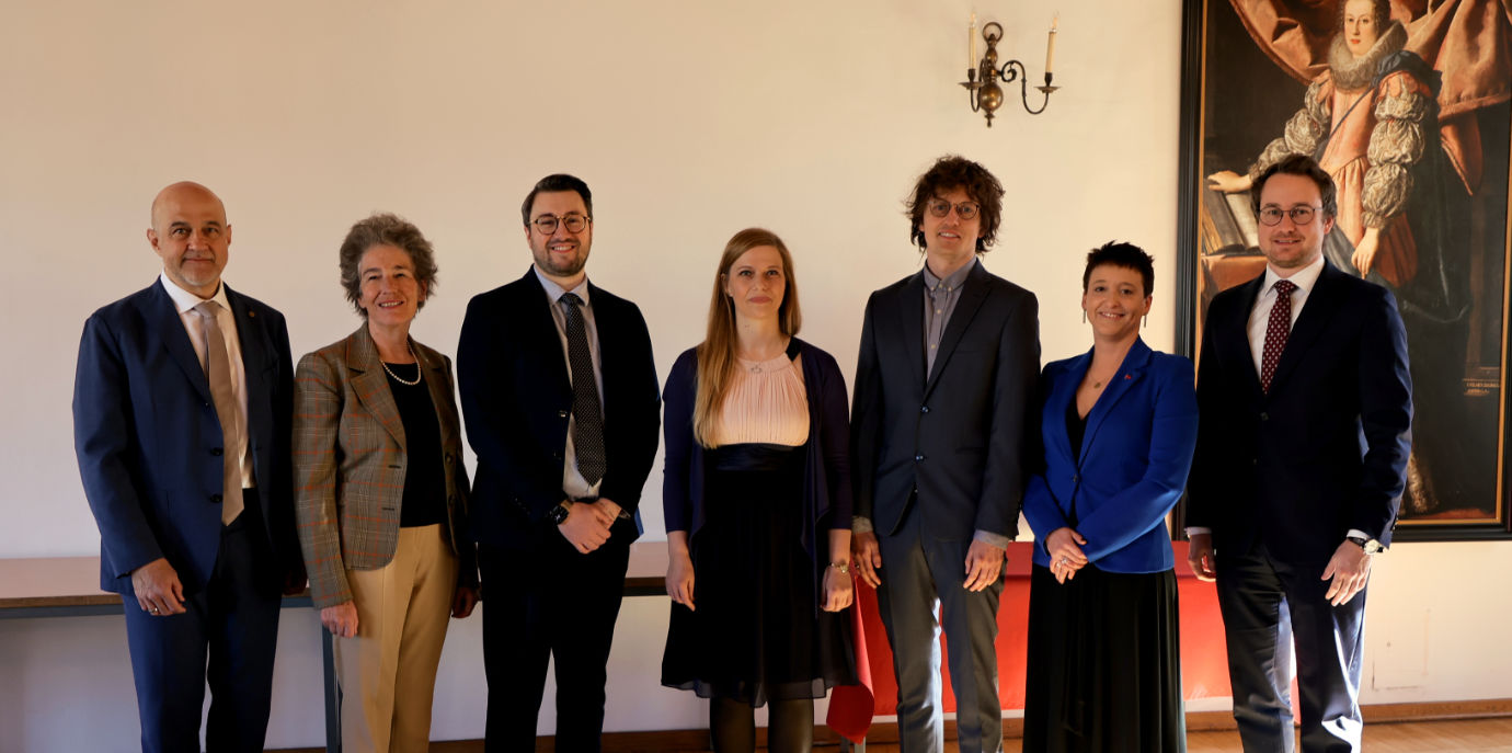 Vizerektor Gregor Weihs (Uni Innsbruck) und Stephan Agnolazza-Hoop (Ministerium für Äußeres, Bildung und Sport, Liechtenstein; beide rechts im Bild) gratulierten den Preisträger:innen. Im Bild mit den Laudator:innen v.l.: Ulla Ratheiser (Leiterin des Instituts für Anglistik), Preisträgerin Monika Kirner-Ludwig, Helmut Ritsch (Institut für Theoretische Physik), Preisträger Karol Piotr Gietka, Preisträgerin Stefanie Geisler, Petronel Tuluc (Institut für Pharmazie).