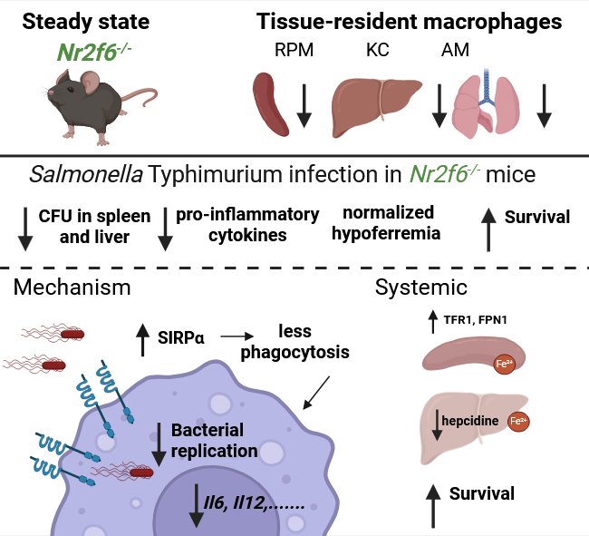 In den anschließenden Infektionsversuchen produzierten die Nr2f6-/--Mäuse weniger entzündungsfördernde Zytokine, wiesen eine geringere Bakterienlast auf und zeigten insgesamt eine abgeschwächte Aktivierung des Immunsystems. Salmonellen nutzen normalerweise Makrophagen als Rückzugsort aus und werden von ihnen im Körper weitertransportiert. Dabei profitieren sie vom dort gespeicherten Eisen, das sie für ihr Wachstum benötigen. Der Körper versucht im Infekt zwar, verfügbares extrazelluläres Eisen zu reduzieren, doch dadurch steigt gerade in Makrophagen die Eisenkonzentration. Das Team fand Hinweise darauf, dass NR2F6 diesen Eisenstoffwechsel während der Salmonelleninfektion mittels  Makrophagen reguliert.