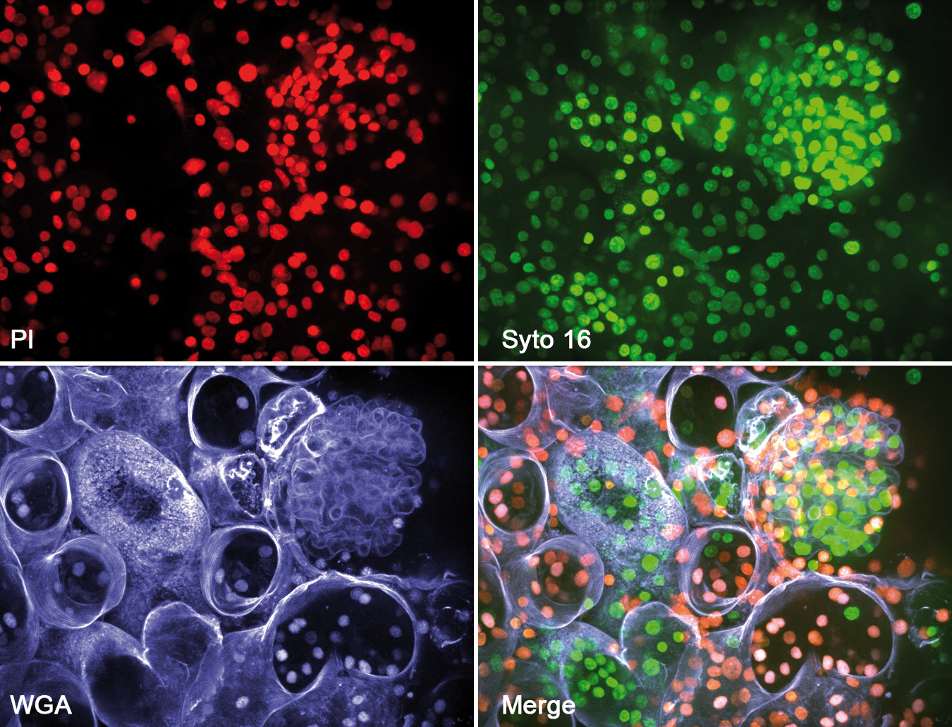 In der Untersuchung der Gewebeproben mit dem konfokalen Mikroskop erscheinen geschädigte Zellen nach Färbung mit einem speziellen Farbstoff rot (PI), während sich gesunde Zellen grün (Syto16) darstellen. Zellmembranen werden mit Weizenkeimagglutinin (WGA , blau) sichtbar gemacht, was einen Rückschluss auf die Unversehrtheit der Zellarchitektur zulässt. Ein Gesamteindruck entsteht, wenn man alle 3 Bilder kombiniert (Merge).