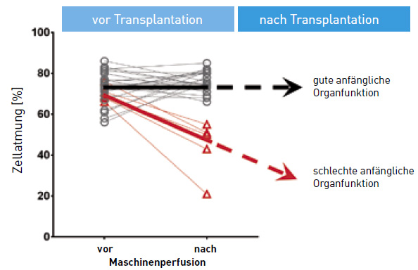 Auch Veränderungen in der Zellatmung während der Maschinenperfusion korrelieren mit Funktionseinschränkungen der Leber nach einer Transplantation. Gewebeproben werden dazu mit dem in Innsbruck entwickelten Respirometer (Firma Oroboros) analysiert. Mit Hilfe dieser und anderer Untersuchungen kann also heute schon vorhergesagt werden, wie und ob Organe nach der