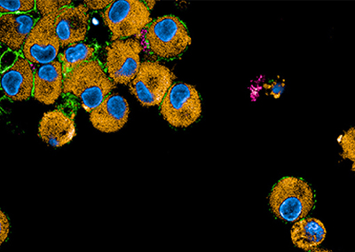 BU (li): Komplement Rezeptor-gefärbte, Virus-infizierte Immunzellen (Virus in Pink; Komplementrezeptor in Grün, Zytoplasma in Orange; Zellkerne in Blau). (c) Doris Wilflingseder