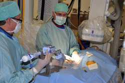 1. Neue Herzkatheterintervention an der Universitätsklinik für Innere Medizin III Innsbruck: mit MitraClip (Metallklammer) gegen Herzinsuffizienz (im Bild v.l.: Kardiologe Doz. Dr. Thomas Bartel, Herzchirurg Prof. Dr. Ludwig Müller)