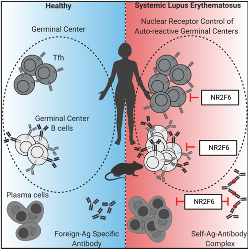 Adaptive immune responses are tightly regulated, in order to avoid self-recognition that could lead to autoimmune disease. The orphan nuclear receptor NR2F6 is a validated key player in the suppressor pathway of T-cell-mediated immunity. The research employs biochemical, molecular and cellular analyses of the signal transducing nuclear receptor network of NR2F6 within the CD4+ T-cell subsets that orchestrate humoral immune responses (Fig. 2).
