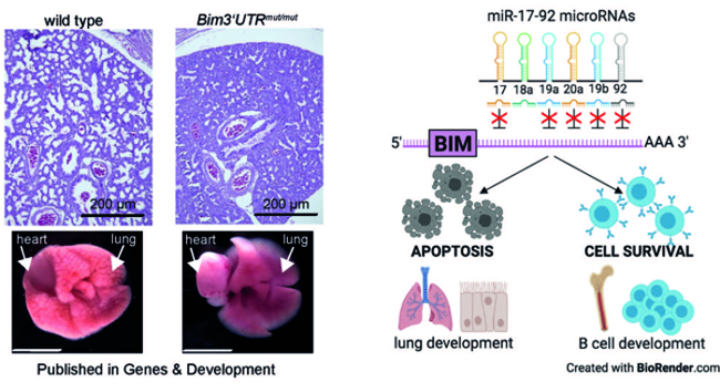 - The binding of miR-17~92 to a single target gene is essential for life – The regulation of BIM transcript levels by miR-17~92 microRNAs serves as a rheostat, which controls cell survival in the developing lung (Fig. 5).