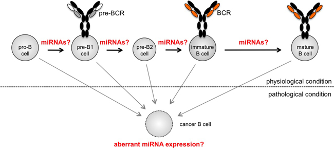 In our group, we are interested in deciphering the role of one type of such non-coding RNAs, microRNAs (miRNAs), in the regulation of complex transcriptional networks, using haematopoiesis and immune function as experimental model systems. MicroRNAs (miRNAs) are small, non-coding RNAs that mediate post-transcriptional silencing of a predicted 60% of protein-coding genes in mammals. Although discovered by Ambros and Ruvkun only in 1993, they have quickly emerged as central mediators of many, if not all, biological processes. In our work, we are trying to decipher how microRNAs influence lymphocyte development and function or, if aberrantly expressed, contribute to diseases such as cancer (Fig. 6). To elucidate the role of individual miRNAs under physiological as well as pathological conditions, we combine gain and loss-of-function approaches, both in in vitro systems and in gene-modified mouse models, with cell biological, biochemical and molecular approaches.