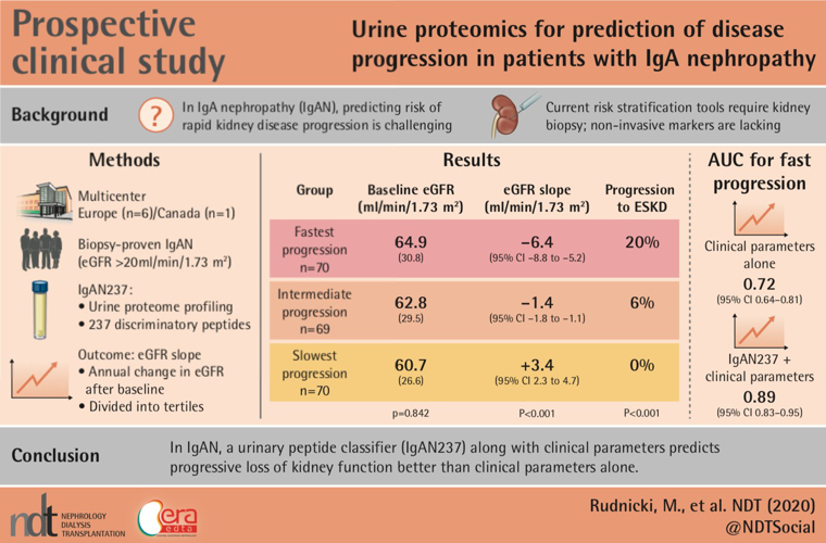 2. IgA Nephropathy: Kidney function decline in IgA nephropathy (IgAN) can be significant and is not predictable using the available clinical and histological tools. The EU/FWF-funded programme PERSTIGAN identified a urinary biomarker-based classifier (IgAN237), which showed significant added value for the prediction of disease progression compared with the clinical parameters (age, gender, proteinuria, eGFR, mean arterial pressure). This proteomic supported panel is available as an online risk calculator (www.perstigan.eu) and is undergoing further evaluation of its potential to guide treatment decisions in a prospective clinical trial.