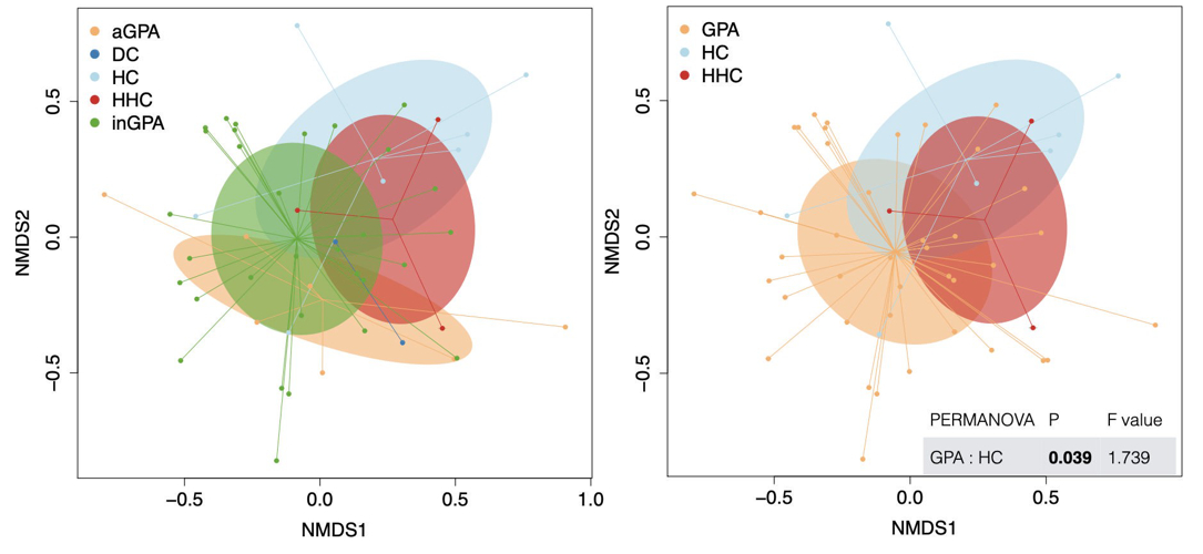 NMDS analysis of bacterial 16S marker gene sequenced species. a) The healthy control cluster separates the majority from the inactive and active GPA cluster. b) The GPA cluster (including active and inactive cases) was statistically different from the healthy control cluster.