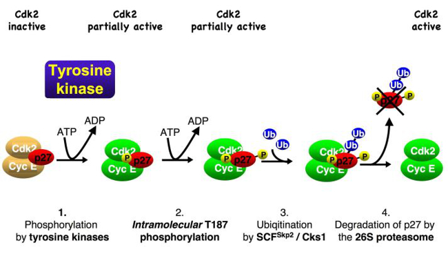 p27 regulates cell cycle progression over the restriction point. Abundant p27 binds and inactivates CDKs and can prevent cell proliferation. The CDK inhibitor protein becomes unstable upon cyclin/CDK2 activation, as cells traverse the restriction point and progress towards the S-phase. A positive feedback loop couples p27 ubiquitin-dependent degradation to CDK activation (Fig. 2). The molecular mechanism that can initiate this feedback loop in the presence of abundant CDK inhibitors and thus inactive CDKs has long remained an enigma.