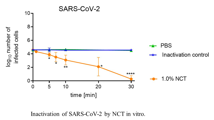 Basic research currently comprises its microbicidal activity against viruses including SARS-CoV-2, multiresistant bacteria and fungi biofilms. Latest clinical investigations cover the bronchopulmonary system (confirmatory phase II inhalation of NCT in Covid-19 patients planned) as well as various other topical applications, such as to the skin and mucous membranes, the eye, the ear-nose-throat region, the urinary tract and organ abscesses. Advantages of NCT include high tolerability, a broad spectrum of activity against all strains of pathogens without inducing resistance, inactivation of virulence factors of pathogens, enhancement of microbicidal activity in the presence of body fluids and anti-inflammatory effects.