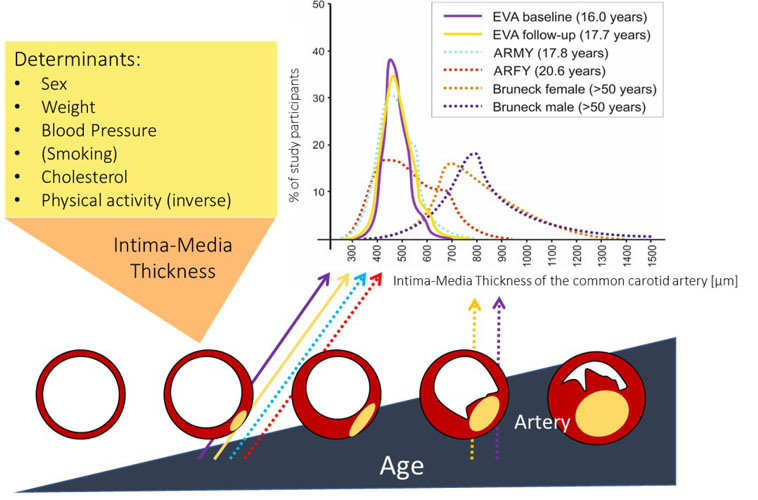 EVA4YOU is a study that builds on the existing knowledge gained from the EVA study. It aims to improve vascular health of 15/16-year-old Tyrolean pupils and apprentices and to elucidate mechanisms of early vascular ageing (Fig. 3). The current database concerning the influence of prematurity, neonatal growth characteristics and feeding practices on early vascular ageing will be extended and associations with additional risk markers for cardiovascular diseases will be elucidated.