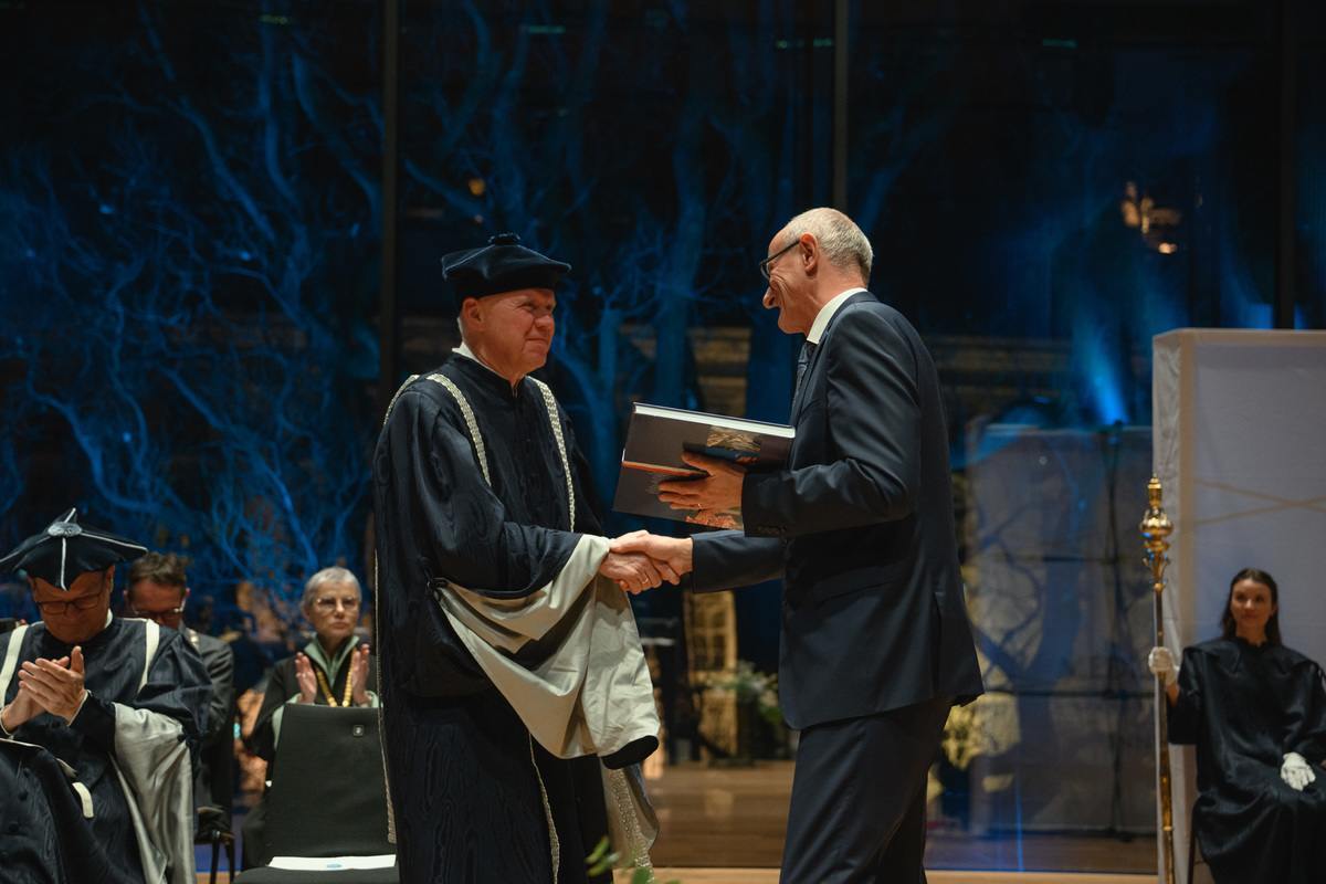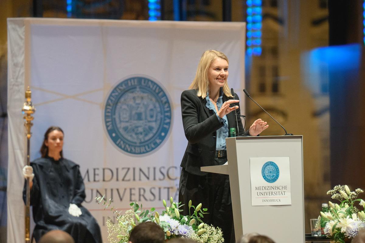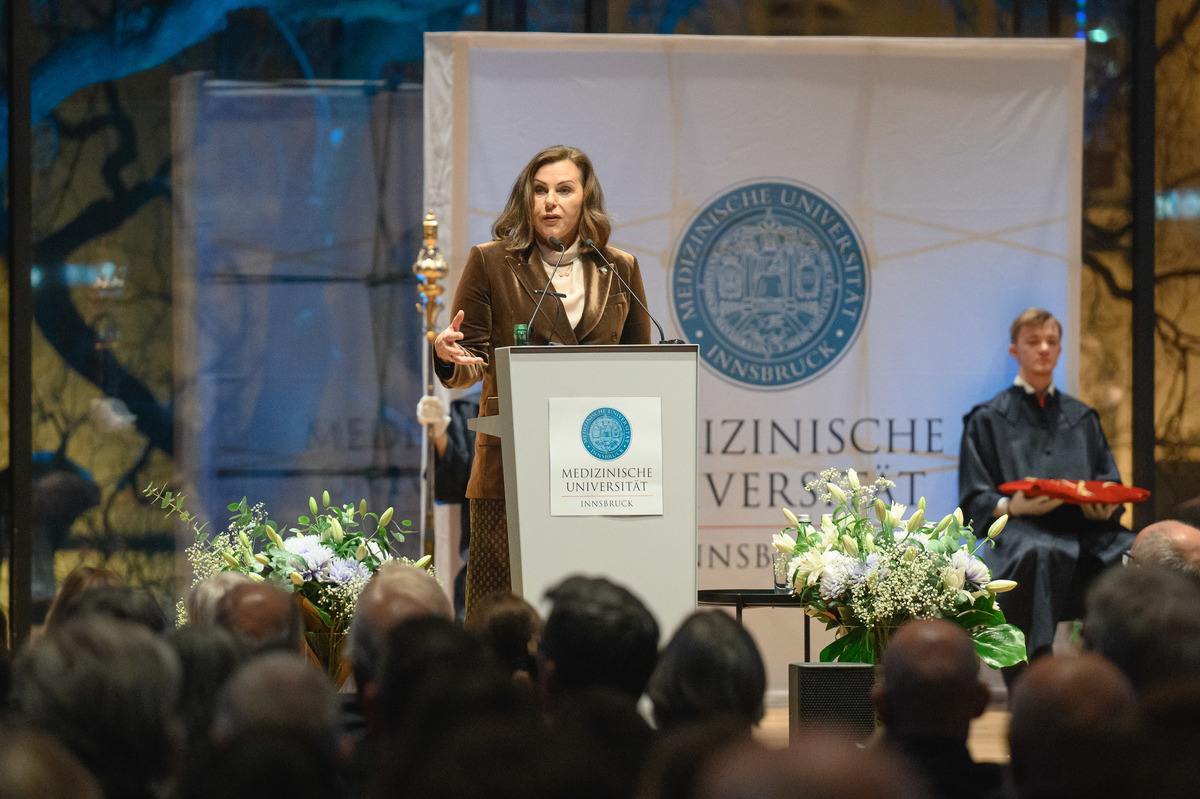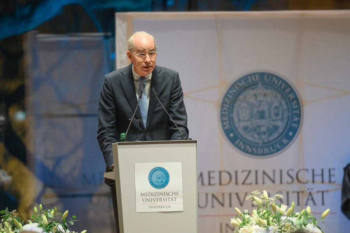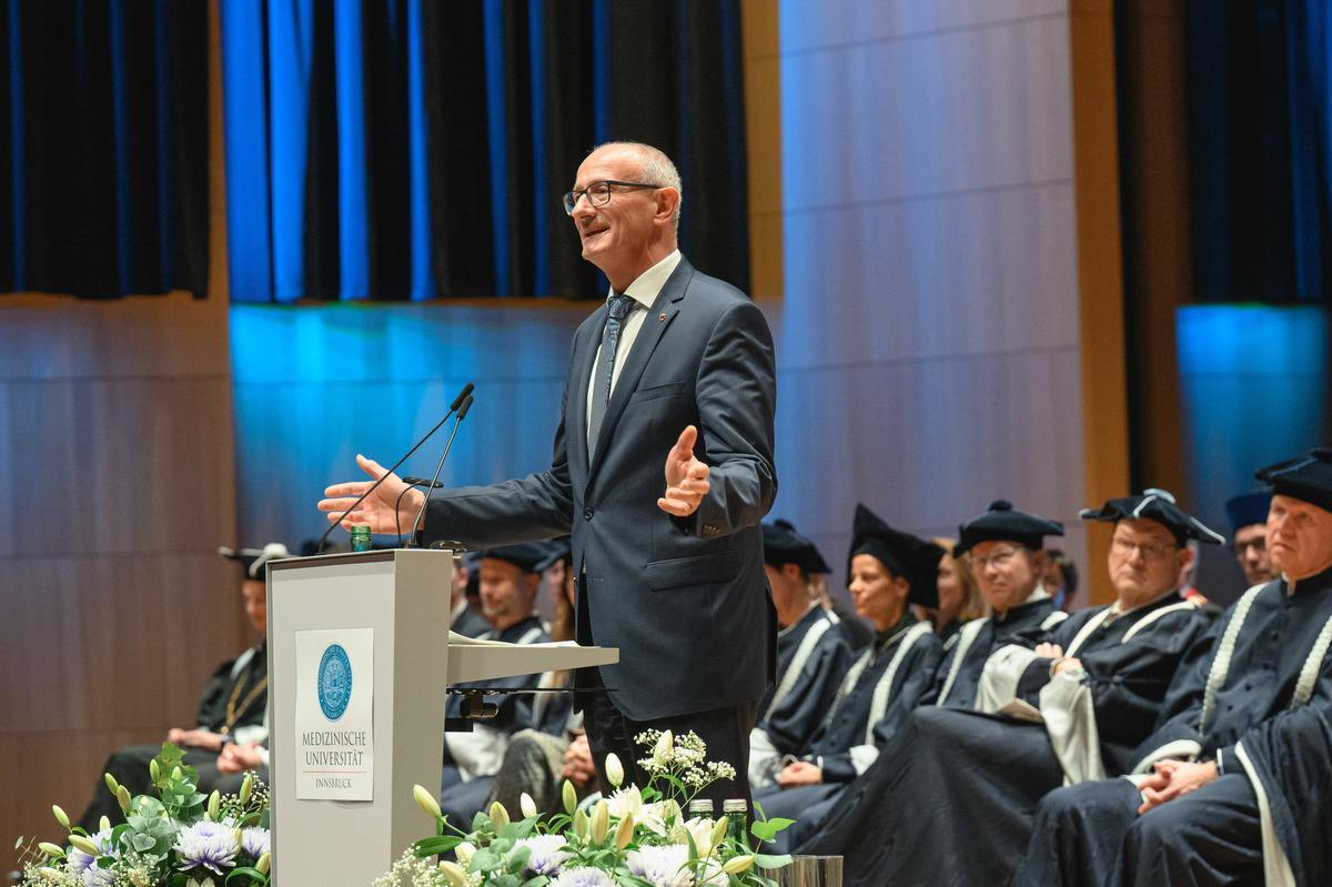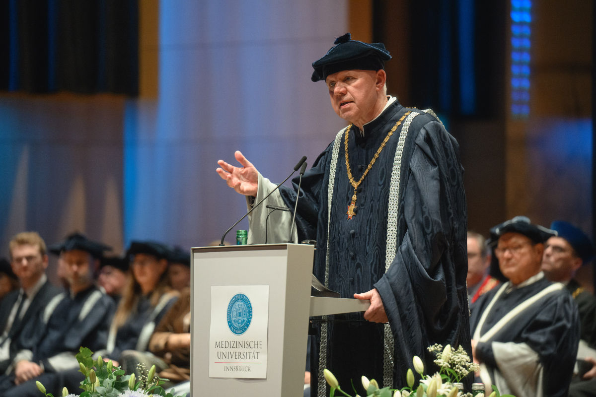 Der Festakt stand im Zeichen des Mottos „gemeinsam weiterentwickeln“. In seiner Antrittsrede spannte Rektor Mayer den Bogen von persönlicher Erfahrung bis zu den großen Herausforderungen universitärer Medizin. Er betonte die Verantwortung der Medizinischen Universität Innsbruck für exzellente Lehre, innovative Forschung, spitzenmedizinische Krankenversorgung und eine aktive „dritte Mission“ im Dialog mit der Gesellschaft. „Wir müssen erklären, was Wissenschaft kann und was nicht, gleichzeitig aber darauf hinweisen, dass es kein besseres Instrument gibt, Entscheidungsfindungen zu unterstützen. Dazu brauchen wir starke Universitäten“, betonte Mayer.